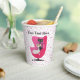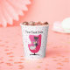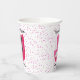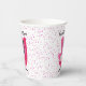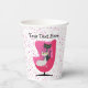 These paper cups are white with bright pink dots and a mid century style chair done in shades of pink with a black and a white fancy looking cat sitting in the chair. Customise your text with the templates on the front and back.