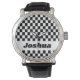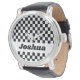 Cool, custom, unique, one-of-a-kind watch has a black and white chequered flag design on the front. Personalise the front by changing the name to whatever you like. This would make a great gift for the race car enthusiast in your life. Please see our other custom chequered flag items.