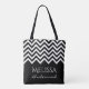Elegant black and white chevron zig zag stripe bridesmaids tote bags. Stylish zigzag print with personalised name, monogram or funny quote. Modern pattern design for bride and brides crew or entourage. Customisable background colour. Cute DIY wedding accessory for bridal team; brides maids, maid of honour, mother of the bride, flower girl etc. Fun for trendy wedding, chic bridal shower, bachelorette party, thank you favours etc. Change the quantity to get the cheap bulk price. Classy typography template. Double sided design.