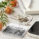 Keychain featuring a black and white photograph of the Chicago city skyline. You can customise the it with any name.