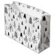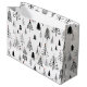 Hand drawn black and white Christmas trees in multiple styles are scattered over this gift bag. Notice the classy gold stars that adorn the tree which gives the wrapping paper a bit of shimmer and a lovely touch. The elegant paper is perfect for those who love simple B&W as well as minimalists. Looks fabulous under the tree. See our other black and white paper selections as well.