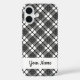 A unique editable phone case with retro script letters on a background of a black and white glen inspired plaid pattern.
