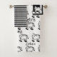 Fun kid's bath towel set, with the bath towel done in white with cute black and white cartoon zebras all over.  The hand towel is done in a black and white stripe and the washcloth is a black with a white large border and one large, cute zebra.  Sweet towel set for any young child's bathroom.