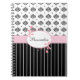 A trendy notebook with a chic black and white damask pattern on the top and sassy pinstripes on the bottom, divided by a girly pink floral frame. Personalise by adding your name. Perfect present for the stylish and fashionable woman who likes stripes and a damask damask pattern.