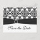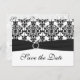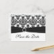 This black and white damask save the date post card has a faux ribbon and jewels and matches the wedding invitation shown below. If you require any other matching items in this design, please email your request to niteowlstudio@gmail.com.