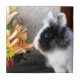 Portrait of black and white dwarf rabbit (Mammal) near yellow daisies