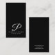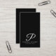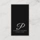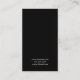 A black and white elegant design featuring white elegant script monogram with business information in white professional font style on black background.