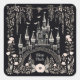 A whimsical black and white illustration of a fairytale castle with whimsical florals.