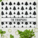 Destei's original pattern of simple black Christmas fir tree silhouettes on a white background colour. There is also a personalizable text area for a name or other custom text. This design was created with the modern minimalist aesthetic in mind.
