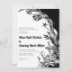 Black and white flowers in vintage style and typography floral wedding invitation, displaying a vintage black white floral border on black and white background.