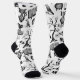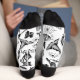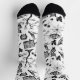 These fun and spooky Halloween socks, hand-drawn Halloween illustrations in black ink, feature an assortment of Halloween-themed drawings, including a pumpkin, witch's hat, a broom, a bubbling cauldron, an enigmatic black cat, an ancient spell book, spiders and their intricate webs, an old spooky oak tree, a vintage bird cage, a raven, and gothic flowers.