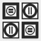 Bold geometric pattern features four black squares with white space between them. The two diagonally opposed thick squares each contain a thin black circle with a thick equal sign inside. In contrast, the two thin squares each contain a thick black circle that touches the square’s edges with a thin vertical equal sign inside.