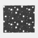 This image features a modern, abstract geometric pattern in black and white. It consists of various-sized squares and rectangles arranged randomly across a black background. Some shapes are solid white, while others are outlined, creating a layered effect. Small dots and pixel-like elements are scattered throughout, adding depth and texture. The overall design is minimalistic and conveys a digital or futuristic aesthetic.