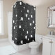 This image features a modern, abstract geometric pattern in black and white. It consists of various-sized squares and rectangles arranged randomly across a black background. Some shapes are solid white, while others are outlined, creating a layered effect. Small dots and pixel-like elements are scattered throughout, adding depth and texture. The overall design is minimalistic and conveys a digital or futuristic aesthetic.