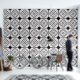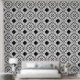 A stylish modern black and white geometric abstract shapes and quatrefoil shaped peel and stick wallpaper wall treatment, to modernise your bath, kitchen, or any room. Perfect when you live in a rental apartment that needs your personal style and touches of design to make things pop. Peel and stick wallpaper is one of the best DIY hacks for apartment dwellers to give them more control over their home decor style! Go wild with patterns and colours. Comes in smooth and textured. Get the textured for bumpy textured walls, and smooth or textured for smooth walls.
