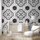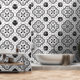 A stylish modern black and white geometric abstract shapes and quatrefoil shaped peel and stick wallpaper wall treatment, to modernise your bath, kitchen, or any room. Perfect when you live in a rental apartment that needs your personal style and touches of design to make things pop. Peel and stick wallpaper is one of the best DIY hacks for apartment dwellers to give them more control over their home decor style! Go wild with patterns and colours. Comes in smooth and textured. Get the textured for bumpy textured walls, and smooth or textured for smooth walls.