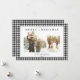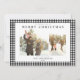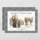 Create your own custom photo Christmas cards featuring two of your family pictures alongside personalized minimalist typography name and year on a classic black and white gingham plaid pattern background.
