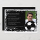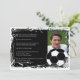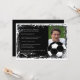 This graduation announcement has a modern funky design! The background is black with a white grunge frame and a black and white graphic of a soccer ball. Behind the soccer ball is a cutout to frame your photo and to the left is an area for your custom text. Very cool and a great way to celebrate your soccer star!
