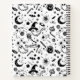 A cute black and white line art design featuring a ghost adorned with a witch hat, surrounded by iconic Halloween elements like a pumpkin bucket, candy canes, lollipops, a bat, and celestial bodies. This minimalist design adds a touch of intrigue to your gift.