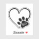 Explore the beauty of a heart-shaped design featuring a black paw print on white with a pet name, ideal for adding style and personality to your space.