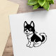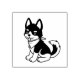 Black and white cartoon illustration of a sitting husky dog with a happy grin, tongue out. A simple kerchief is tied around its neck.