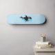 a traditional watercolor artwork of a black and white orca or killer whale on a light blue coloured skateboard