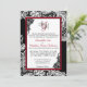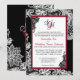 Elegant white lace over black background with monogram and red contrast formal wedding invitation card.