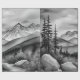 Black and white landscape painting of mountains