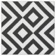Stylish modern fabric features an original, bold black and white geometric pattern. White meanders angle around black diamonds containing white diamonds. Black zigzags provide subtle separation between the winding paths.