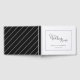 This wedding guestbook features a modern and minimal design in black and white. Trendy handwritten calligraphy is accented with a thin black border. Custom text allows you to add the names of the couple and their wedding date. The backside is black with a diagonal white stripe pattern.