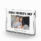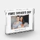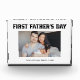 This modern Father's Day photo block for the first time dad features a simple, white background with masculine black script typography that says "First Father's Day." Add a photo of him and the baby, with room to personalise with names and year.
