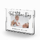 This lovely Mother's Day photo block for the first time mother features a simple, white background with black modern script typography that says "First Mother's Day." Add a photo of her and the baby, with room to personalise with names and year.
