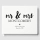 Wedding guestbook in black and white with mr & mrs written in a bold calligraphy font above your shared last name and wedding date.