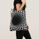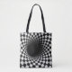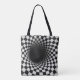 A tunnel-like optical illusion is created using a black and white chequered pattern, giving a dizzying sense of depth