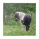 Photograph of a black and white paint pony standing in a meadow of grass and wildflowers.