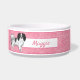 Destei's original cartoon illustration of a cute black and white coat colour Phalène breed dog on a pink background colour with a pattern of hearts in different sizes. There is also a personalizable text area for a name or other custom text.