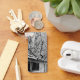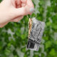 This keychain features a black and white photograph of a snowy rustic scene during a winter storm along with customisable on the back.