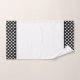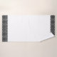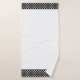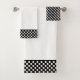 A modern white bathroom towel set with a stylish black and white polka dot trim.
