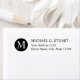A black and white professional design featuring name and address in black professional font style with white monogram on black circle element on white background .