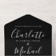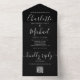 All in one wedding invitation featuring elegant signature script name and monogram initials on a black background. The invitation includes a perforated RSVP card with your wedding website QR code. Designed by Thisisnotme©
