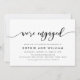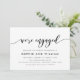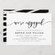 Stylish Engagement Party Invitation featuring the words "We're Engaged" in a relax cursive script in black against a white background. Card has a black back side featuring overlapping white lines.