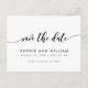 Stylish Save the Date postcard featuring the words "Save the Date" in a relax cursive script in black against a white background.