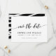 Stylish Save the Date card featuring the words "Save the Date" in a relax cursive script in black against a white background. Card includes a black back side featuring overlapping white lines.