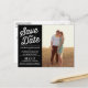 Photo save the date announcement featuring retro typography on a chalkboard background.
