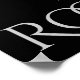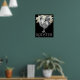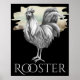 This poster features a beautiful hand drawn black and white rooster perched atop the text "Rooster". The background is dramatic black with a watercolor splash background.