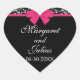 This sticker features an elegant black and white rose pattern, a hot pink bow and white text on a black background.