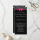 This formal wedding program features an elegant black and white rose pattern, a hot pink bow and white text on a black background.