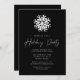 Modern holiday party invitations featuring a white snowflake at the top of the design with a festive black background. "Holiday Party" is displayed in a white handwritten script. Personalise the snowflake holiday party invitations with your party details.