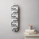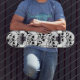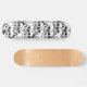 This image is a seamless, repeating pattern composed of a dense arrangement of stylised skulls. The skulls are depicted in white with black outlines and are tightly packed together, overlapping significantly to fill the entire frame. Each skull is shown from a similar angled perspective. The background is solid black, creating a strong contrast with the white skulls. The style is graphic and bold, emphasising the sheer number of skulls in a collective mass. The overall aesthetic is dark, macabre, and impactful, forming a visually striking and slightly unsettling pattern.