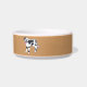 Painting of a white dog with black spots, with its mouth open and tongue hanging out, printed three times around pet bowls. The colour strip can be customised..
